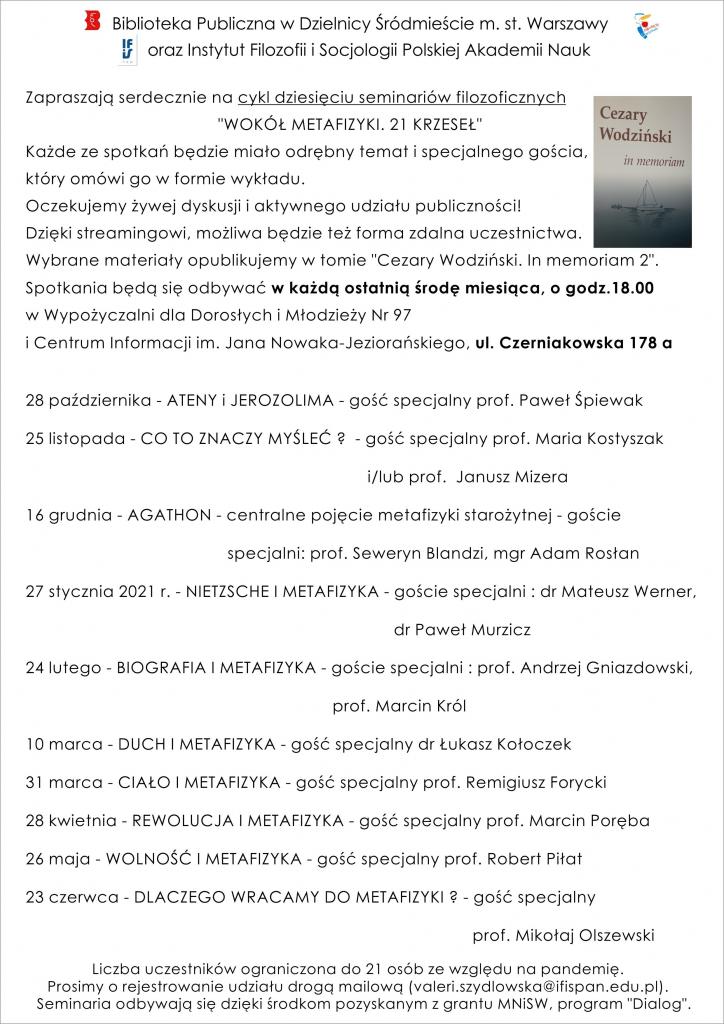 Biblioteka Publiczna w Dzielnicy Śródmieście m.st. Warszawy oraz Instytut Filozofii i Socjologii Polskiej Akademii Nauk zapraszają na cykl dziesięciu seminariów filozoficznych pt.: „Wokół metafizyki. 21 krzeseł”. Każde ze spotkań będzie miało odrębny temat i specjalnego gościa, który omówi go w formie wykładu. Oczekujemy żywej dyskusji i aktywnego udziału publiczności! Dzięki streamingowi możliwa będzie też forma zdalna uczestnictwa. Wybrane materiały opublikujemy w tomie „Cezary Wodziński. In memoriam 2”. Spotkania będą się odbywać w każdą ostatnią środę miesiąca o godzinie 18:00 w Wypożyczalni dla Dorosłych i Młodzieży nr 97, przy ul. Czerniakowskiej 178 a.