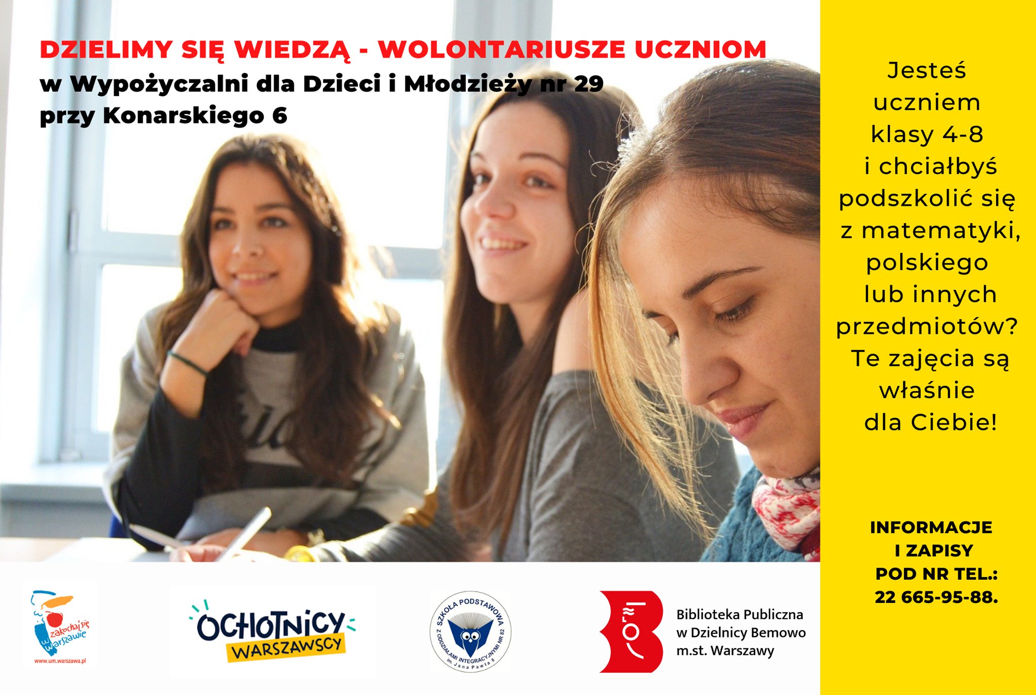 Ruszamy z nowym projektem “Dzielimy się wiedzą – wolontariusze uczniom” w Wypożyczalni dla Dzieci i Młodzieży nr 29 (ul. Konarskiego 6). Nasi wolontariusze będą pomagać uczniom klas 4-8 w podszkoleniu się z matematyki, polskiego lub innych przedmiotów szkolnych. Szczegółowe informacje oraz zapisy pod nr telefonu 22 665-95-88.