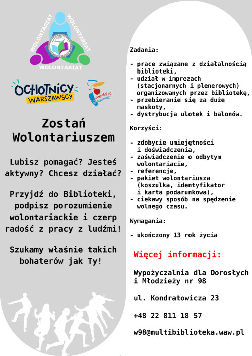 Biblioteka Publiczna w Dzielnicy Targówek m.st. Warszawy uczestniczy w realizacji projektu „Ochotnicy warszawscy”, którego celem jest rozwój i promocja idei wolontariatu w Warszawie.