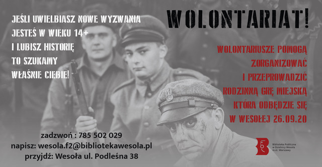 Wolontariat będzie dotyczył pomocy przy organizacji i realizacji Rodzinnej Gry Miejskiej „Rok 1920”, która odbędzie się 26 września 2020 na terenie osiedla Zielona w Warszawie Wesołej w godzinach 12:00-16:00.