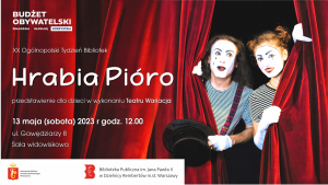 Gdzie można wybrać się na przedstawienia Teatru Wariacja? Oczywiście do biblioteki w Rembertowie! W sobotę 13 maja o godz. 12.00 nasi najmłodsi miłośnicy sztuki będą mogli obejrzeć spektakl pt. „Hrabia Pióro”.