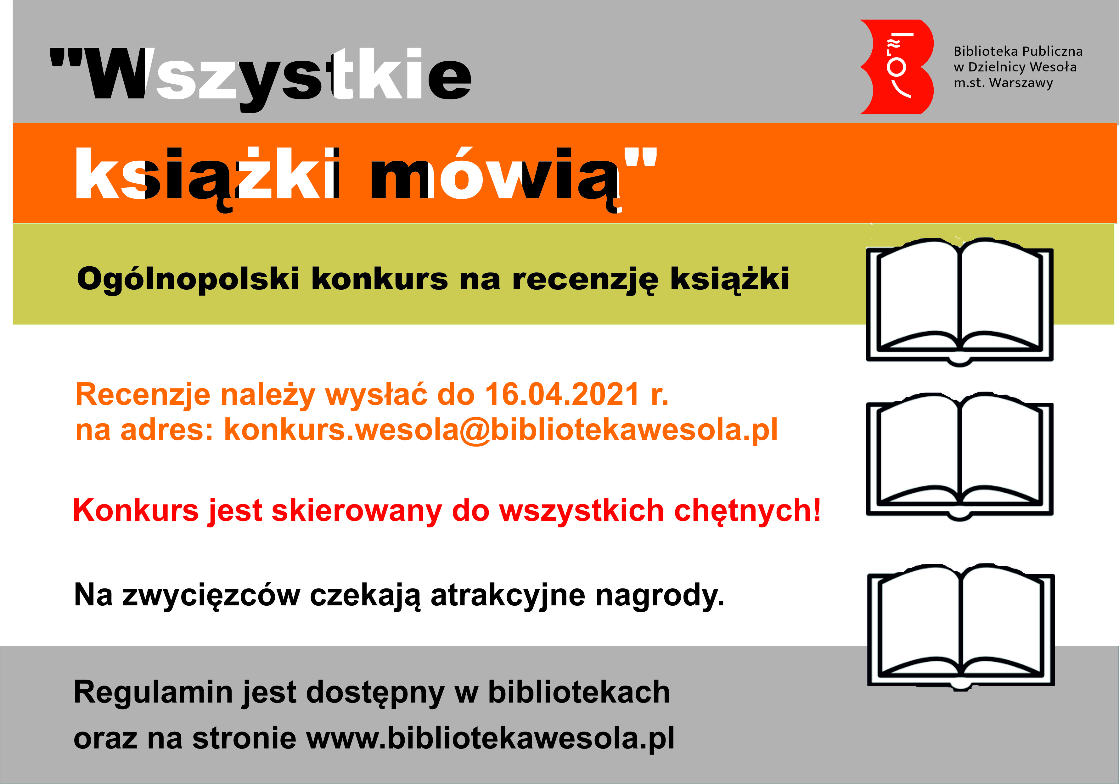 Biblioteka w Wesołej zaprasza do udziału w Ogólnopolskim konkursie na recenzję książki “Wszystkie książki mówią”. Konkurs nie ma ograniczeń wiekowych i jest skierowany do wszystkich chętnych. Recenzje należy przesłać do 16.04.2021 r. na adres: konkurs.wesola@bibliotekawesola.pl
