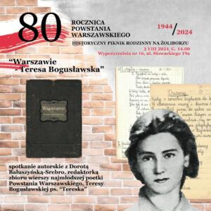 Zapraszamy na spotkanie autorskie z Dorotą Bałuszyńską-Srebro, redaktorką zbioru wierszy najmłodszej poetki Powstania Warszawskiego, Teresy Bogusławskiej ps. “Tereska”, które odbędzie się podczas Historycznego Pikniku Rodzinnego na Żoliborzu, 2 sierpnia 2024 roku, o godz. 14.30 w Wypożyczalni nr 16, ul. Słowackiego 19a.