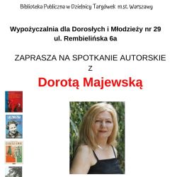 Biblioteka Publiczna w Dzielnicy Targówek m.st. Warszawy zaprasza na spotkanie autorskie z Panią Dorotą Majewską, które odbędzie się 19.10.2022 w Wypożyczalni dla Dorosłych i Młodzieży nr 29 przy ul. Rembielińskiej 6a.