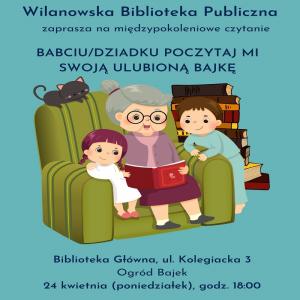 Z okazji Tygodnia Solidarności Międzypokoleniowej Biblioteka w Wilanowie zaprasza na ul. Kolegiacką 3 na międzypokoleniowe czytanie bajek.