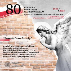 Zapraszamy na wykład „Powstańcze Anioły”, który wygłosi Marcin Łaszczyński, historyk z Oddziałowego Biura Edukacji Narodowej IPN w Warszawie. Spotkanie odbędzie się podczas Historycznego Pikniku Rodzinnego na Żoliborzu. 2.08.2024 r., godz. 17.00, Wypożyczalnia nr 16, ul. Słowackiego 19a.