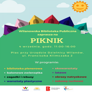2 września w godzinach 11:00-16:00 Wilanowska Biblioteka Publiczna zaprasza na ul. Franciszka Klimczaka 2 na rodzinny piknik.