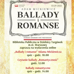 3 września 2022 r. podczas finału 11. edycji Narodowego Czytania w całej Polsce będą czytane utwory Adama Mickiewicza ze zbioru „Ballady i romanse”, uważane za manifest polskiego romantyzmu.