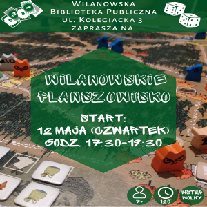 12 maja o godz. 17:30 Wilanowska Biblioteka Publiczna zaprasza rodziny i znajomych na ul. Kolegiacką 3 na „Wilanowskie planszowisko”.