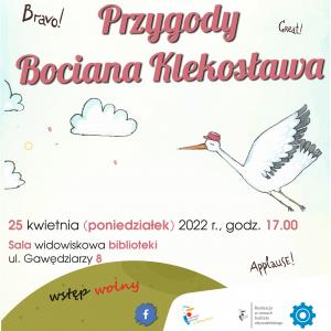 Serdecznie zapraszamy wszystkie dzieci na przedstawienie pt. “Przygody bociana Klekosława” w wykonaniu aktorów Teatru Durr-Moll. Spektakl odbędzie się w sali widowiskowej Biblioteki przy ul. Gawędziarzy 8 w poniedziałek 25 kwietnia o godz. 17:00.
