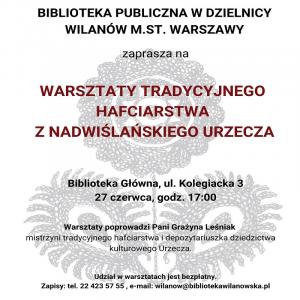 27 czerwca o godz. 17:00 Wilanowska Biblioteka Publiczna zaprasza na ul. Kolegiacką 3 na warsztaty tradycyjnego hafciarstwa z nadwiślańskiego Urzecza.