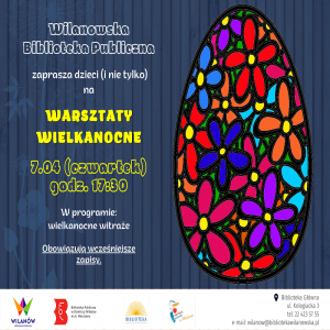 7 kwietnia o godz. 17:30 Wilanowska Biblioteka Publiczna zaprasza na ul. Kolegiacką 3 na warsztaty wielkanocne, na których będziemy tworzyć witraże.
