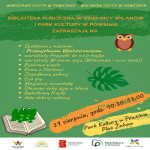 W sobotę 29 sierpnia w godzinach 10:30-13:00 zapraszamy do Parku Kultury w Powsinie na piknik „Warszawa czyta w Powsinie – Wilanów czyta w Powsinie”.