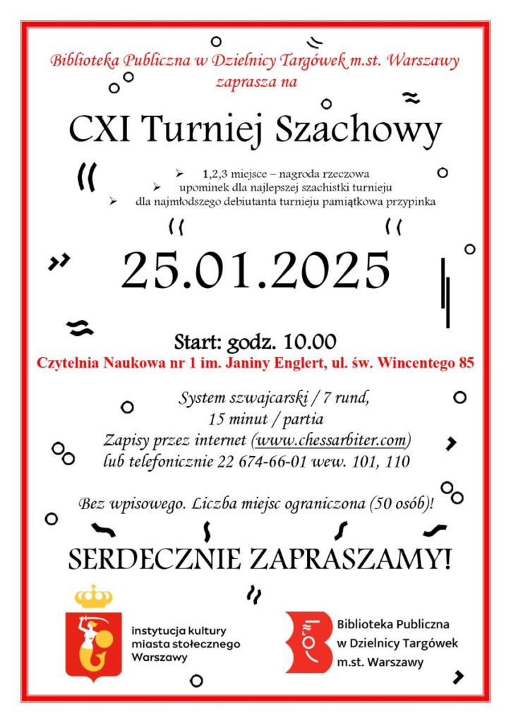 Biblioteka Publiczna w Dzielnicy Targówek m.st. Warszawy zaprasza sympatyków gry w szachy na 111. Turniej Szachowy.