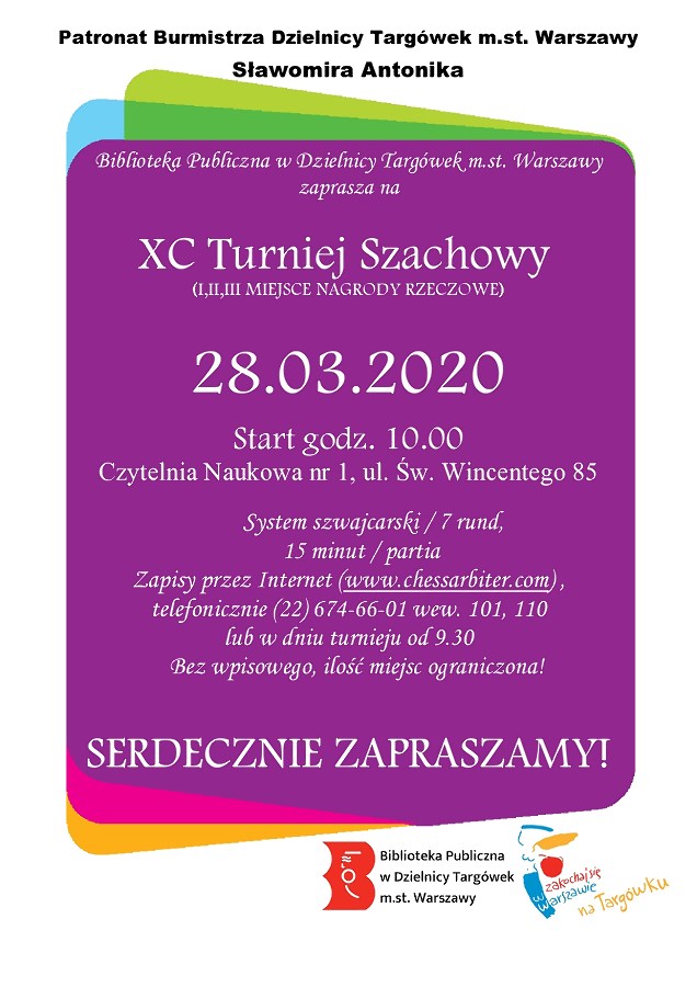 Biblioteka Publiczna w Dzielnicy Targówek m.st. Warszawy zaprasza sympatyków gry w szachy na 90. Turniej Szachowy.