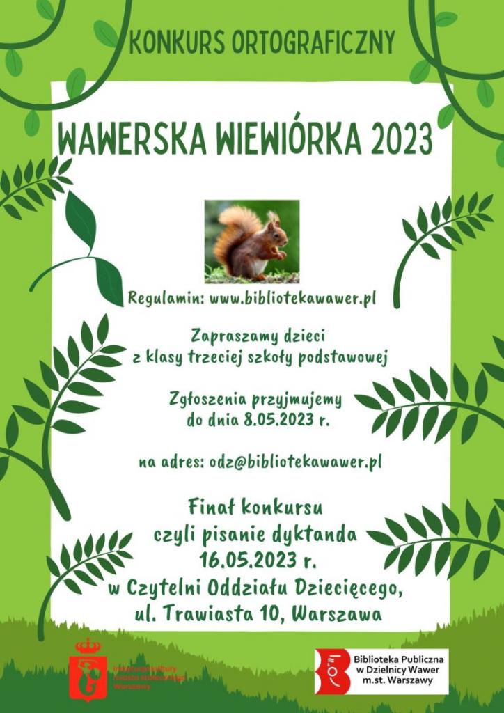 Oddział Dziecięcy zaprasza serdecznie dzieci z klas trzecich szkoły podstawowej do wzięcia udziału w konkursie ortograficznym „Wawerska wiewiórka 2023”.