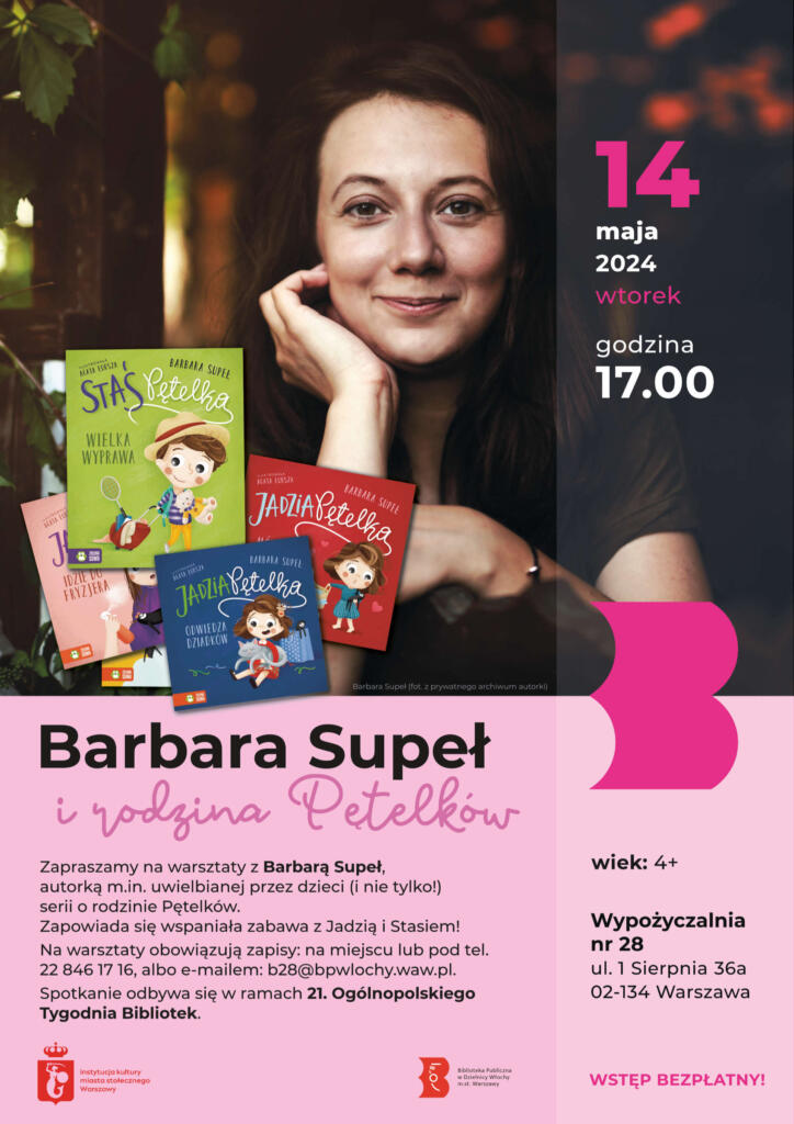 We wtorek 14 maja 2024 o godz. 17.00 Wypożyczalnia nr 28 zaprasza dzieci w wieku powyżej 4 lat wraz z opiekunami na warsztaty z Barbarą Supeł, autorką m.in. uwielbianej przez dzieci (i nie tylko!) serii o rodzinie Pętelków.