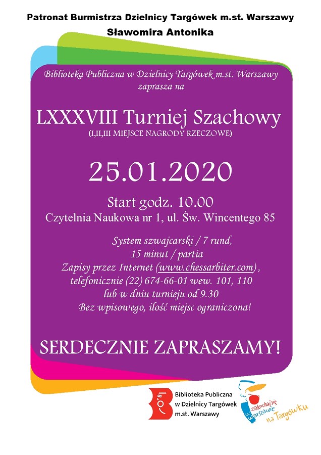 Biblioteka Publiczna w Dzielnicy Targówek m.st. Warszawy zaprasza sympatyków gry w szachy na 88. Turniej Szachowy.