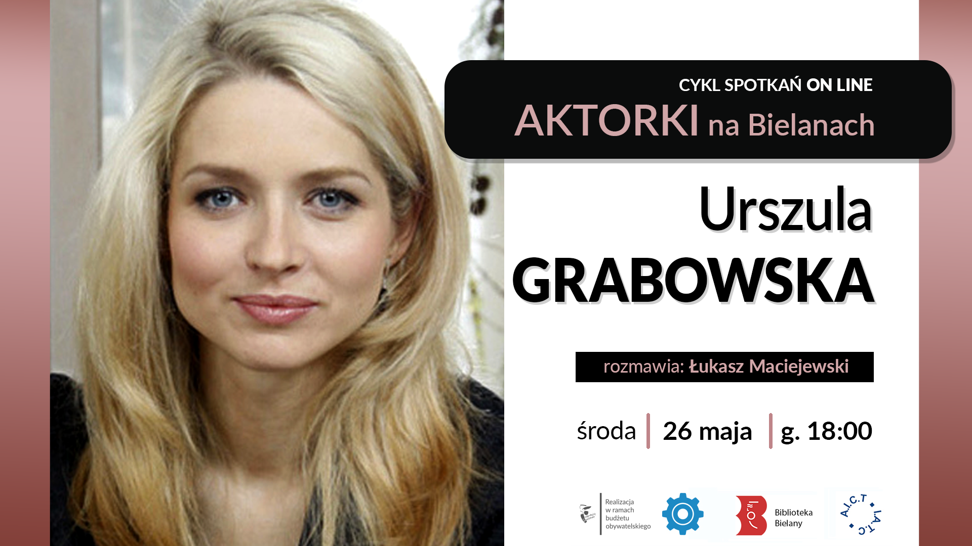 Serdecznie zapraszamy na godzinę 18:00, na spotkanie online z aktorką Urszulą Grabowską w ramach projektu “Aktorki na Bielanach”. Spotkanie poprowadzi Łukasz Maciejewski – krytyk filmowy i teatralny.