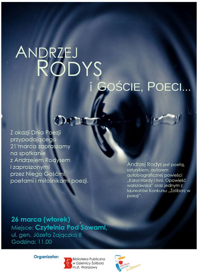 Od kilku lat w Bibliotece Żoliborskiej marzec poświęcony jest propagowaniu twórczości poetyckiej wśród czytelników. Wybór tego miesiąca nie jest przypadkowy, ponieważ od końca lat 90. 21 marca obchodzony jest Światowy Dzień Poezji. W tym czasie zwracamy szczególną uwagę na promocję czytania, pisania, publikowania i nauczania poezji. W tym wyjątkowym miesiącu zapraszamy na spotkanie z Andrzejem Rodysem i Jego Gośćmi, poetami i miłośnikami poezji.