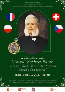 Serdecznie zapraszamy na spotkanie historyczne „Antoni Norbert Patek – sercem Polak, przyjaciel Francji, Czech i Szwajcarii”. Wydarzenie odbędzie się 6 marca 2024 r. o godz. 17.30 w Bibliotece Publicznej w Dzielnicy Praga-Południe m.st. Warszawy, ul. Jana Nowaka -Jeziorańskiego 24 (I piętro, sala dydaktyczna). Spotkanie historyczne objęte jest Honorowym Patronatem Tomasza Kucharskiego Burmistrza Dzielnicy Praga-Południe m.st. Warszawy. Organizatorami są: Towarzystwo Historyczne im. Szembeków oraz Biblioteka Publiczna w Dzielnicy Praga-Południe m.st. Warszawy.