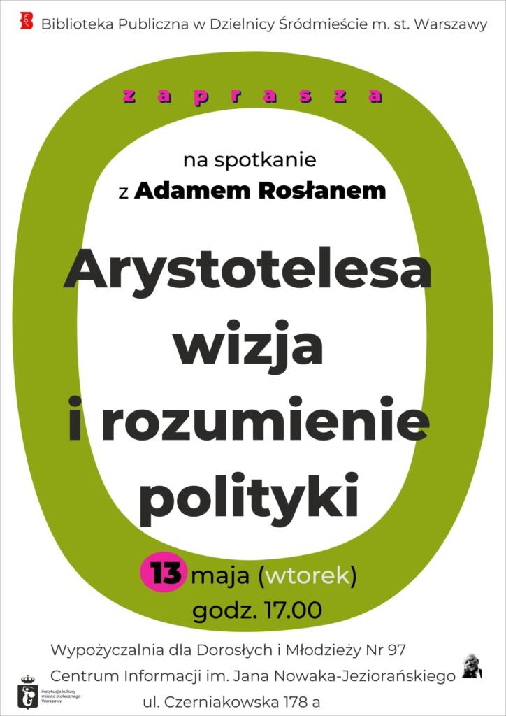 Biblioteka Publiczna w Dzielnicy Śródmieście m.st. Warszawy zaprasza na wykład Adama Rosłana pt. „Arystotelesa wizja i rozumienie polityki”.