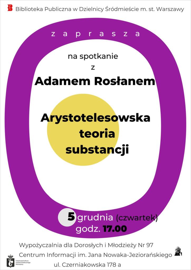 Biblioteka Publiczna w Dzielnicy Śródmieście m.st. Warszawy zaprasza na wykład Adama Rosłana pt. „Arystotelesowska teoria substancji”.