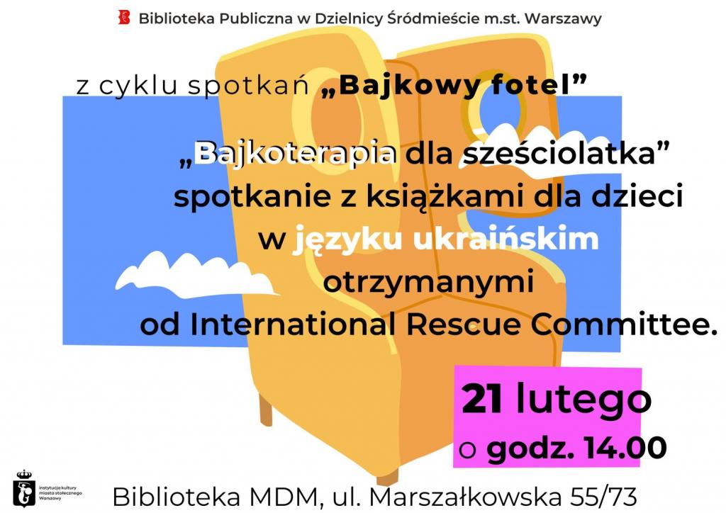 W dniu 21 lutego o godzinie 14:00 Wypożyczalnia dla Dorosłych i Młodzieży nr 7 z Oddziałem dla Dzieci (Biblioteka MDM) przy ul. Marszałkowskiej 55/73, zaprasza dzieci na spotkanie z cyklu „Bajkowy fotel”. Będzie to „Bajkoterapia dla sześciolatka”, czyli spotkanie
