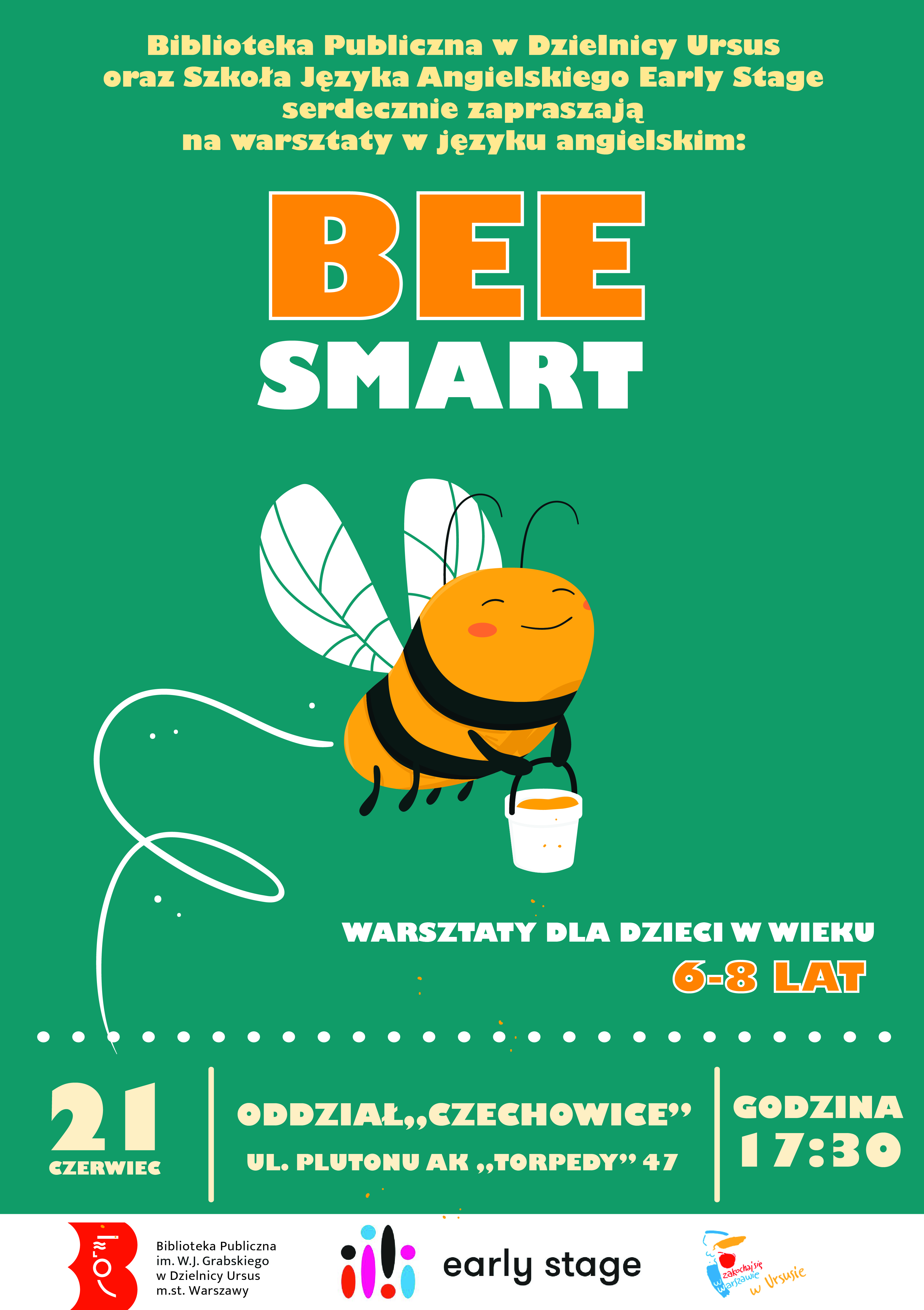 Biblioteka Publiczna im. W.J. Grabskiego w Dzielnicy Ursus oraz Szkoła Języka Angielskiego Early Stage zapraszają na bezpłatne warsztaty dla dzieci „Bee smart” w języku angielskim dla dzieci w wieku 6-8 lat.