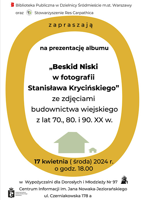Biblioteka Publiczna w Dzielnicy Śródmieście m.st. Warszawy oraz Stowarzyszenie Res Carpathica zapraszają na prezentację albumu „Beskid Niski w fotografii Stanisława Krycińskiego” ze zdjęciami budownictwa wiejskiego z lat 70., 80. i 90. XX w.