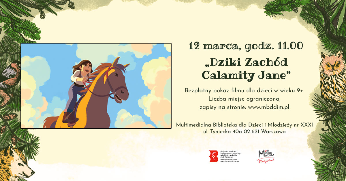 Multimedialna Biblioteka dla Dzieci i Młodzieży nr XXXI zaprasza 12 marca o godz. 11:00 na bezpłatny pokaz filmu „Dziki Zachód Calamity Jane”.