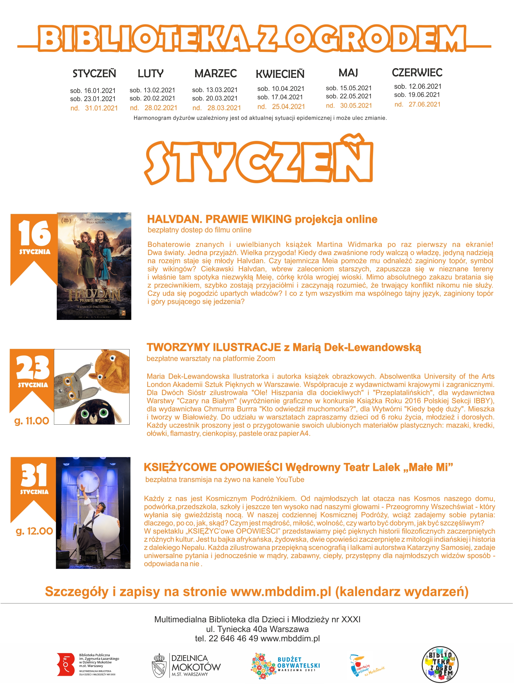 Szczegółowy grafik dyżurów dostępny jest na stronie www.mbddim.pl w zakładce Biblioteka z ogrodem. W dni projektowe jesteśmy otwarci w godz. 10.00-16.00, natomiast wydarzenia kulturalne realizujemy online .