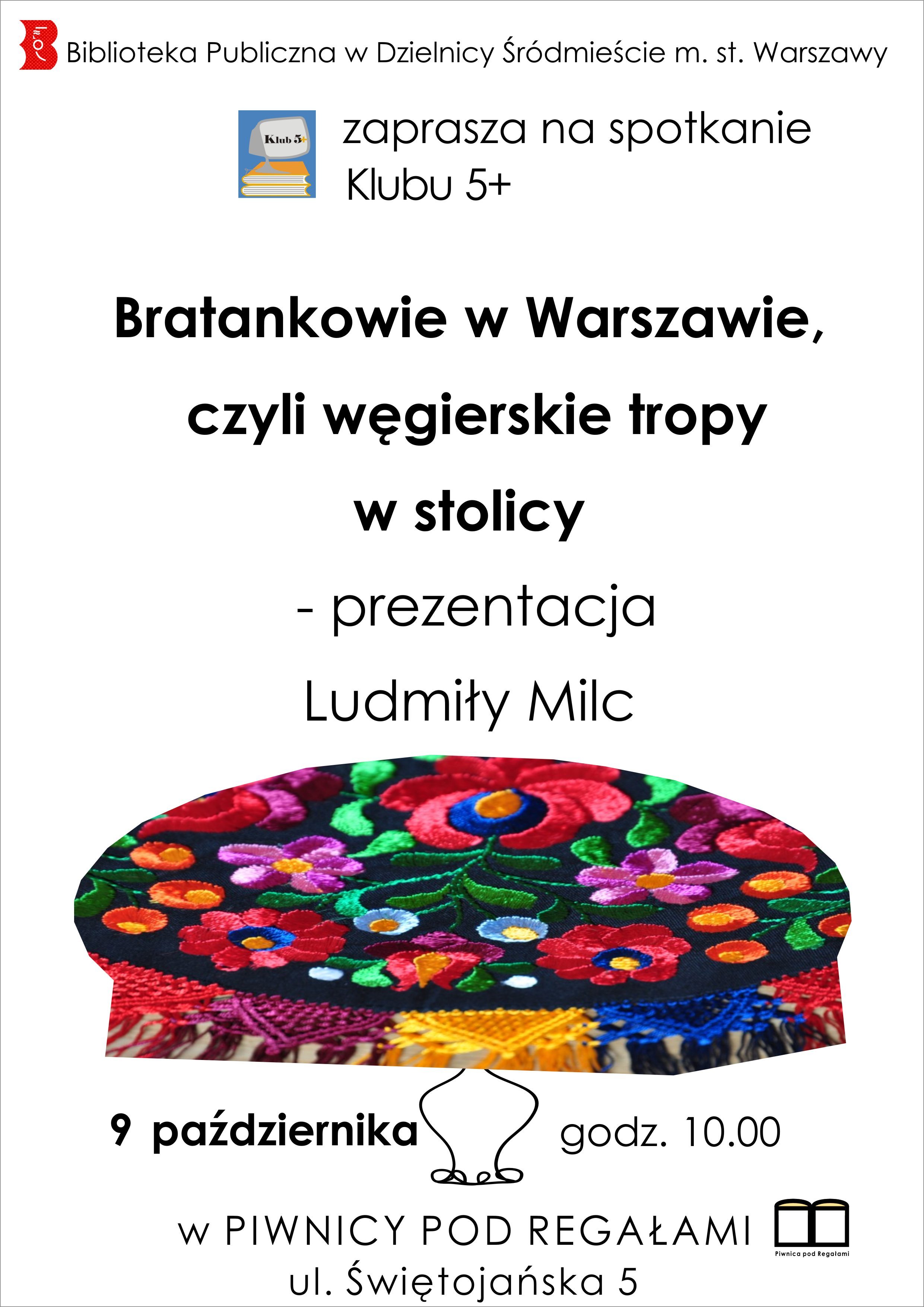 W środę 9 października o godzinie 10:00 Klub 5+, działający w Czytelni Naukowej Nr VII ul. Świętojańska 5, zaprasza do „Piwnicy pod Regałami” na prezentację Ludmiły Milc pt.: „Bratankowie w Warszawie, czyli węgierskie tropy w stolicy”.