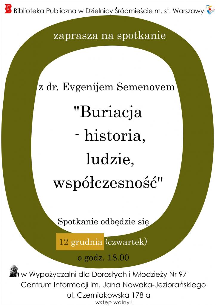 Biblioteka Publiczna w Dzielnicy Śródmieście m.st. Warszawy zaprasza w czwartek 12 grudnia o godzinie 18:00, do Wypożyczalni dla Dorosłych i Młodzieży nr 97 przy ulicy Czerniakowskiej 178Ae na spotkanie z dr. Evgenijem Semenovem pt. „Buriacja – historia, ludzie, współczesność”.