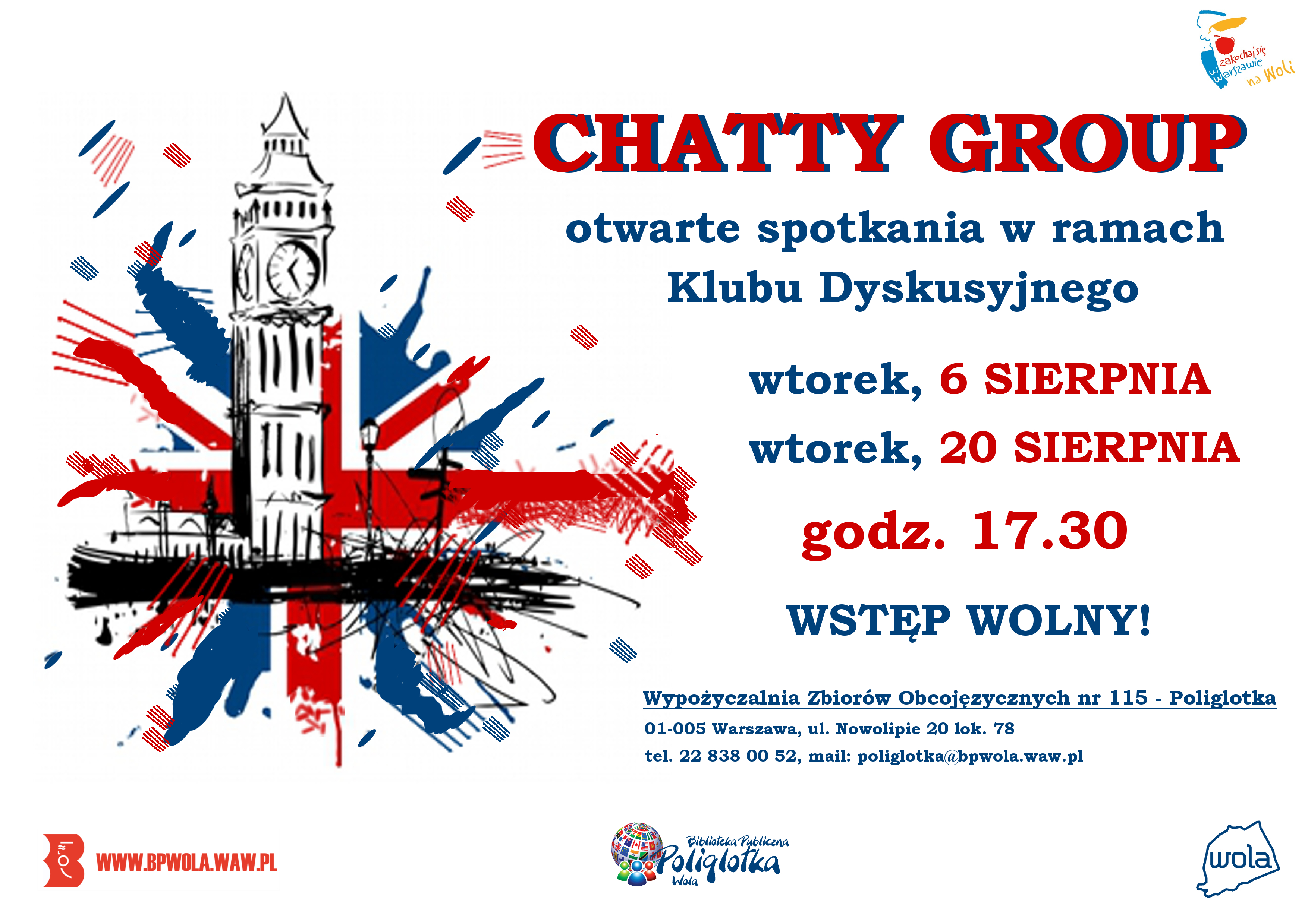Chatty Group, to otwarte spotkania w ramach klubu dyskusyjnego dla znających język angielski na poziomie B1-B2.