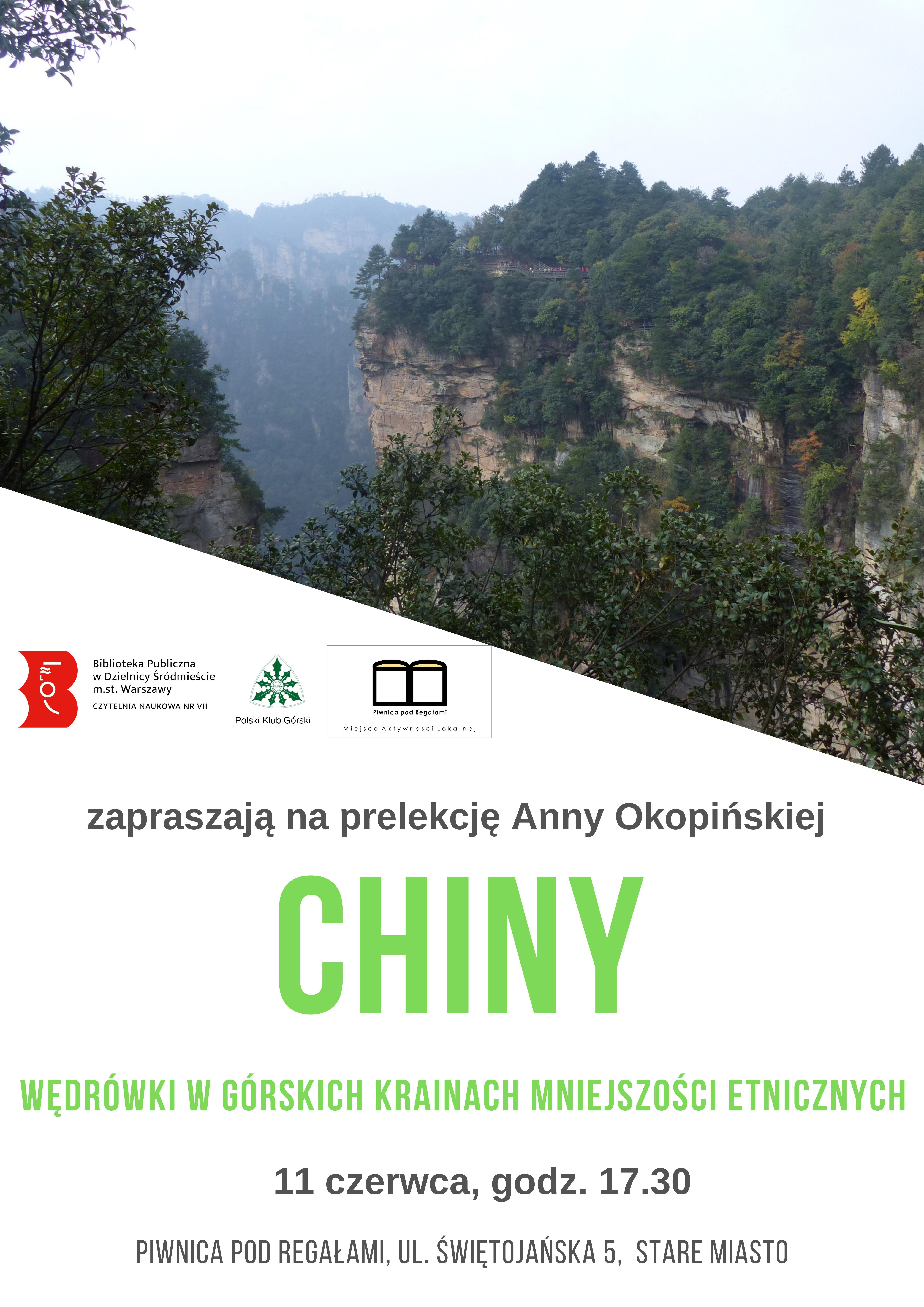 Zapraszamy we wtorek 11 czerwca o godzinie 17:30 do „Piwnicy pod Regałami”, gdzie odbędzie się prelekcja Polskiego Klubu Górskiego, pt.: „Chiny. Wędrówki w górskich krainach mniejszości etnicznych”. Wygłosi ją Anna Okopińska, wspaniała himalaistka, która m.in. w 1975 r. zdobyła Gasherbrum II (8035 m n.p.m.), bijąc polski kobiecy rekord wysokości.