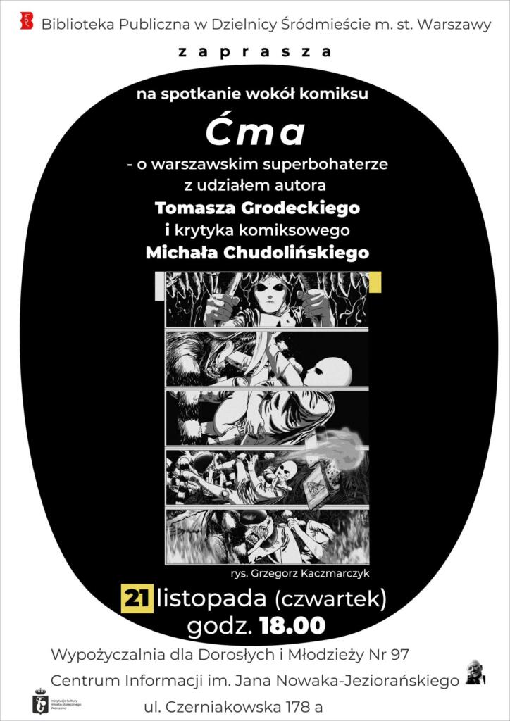 Biblioteka Publiczna w Dzielnicy Śródmieście m.st. Warszawy zaprasza na spotkanie z Tomaszem Grodeckim, pomysłodawcą i scenarzystą komiksu Ćma, nominowanego do Nagrody „Nowej Fantastyki” w kategorii Polski Komiks Roku. Spotkanie poprowadzi Michał Chudoliński,