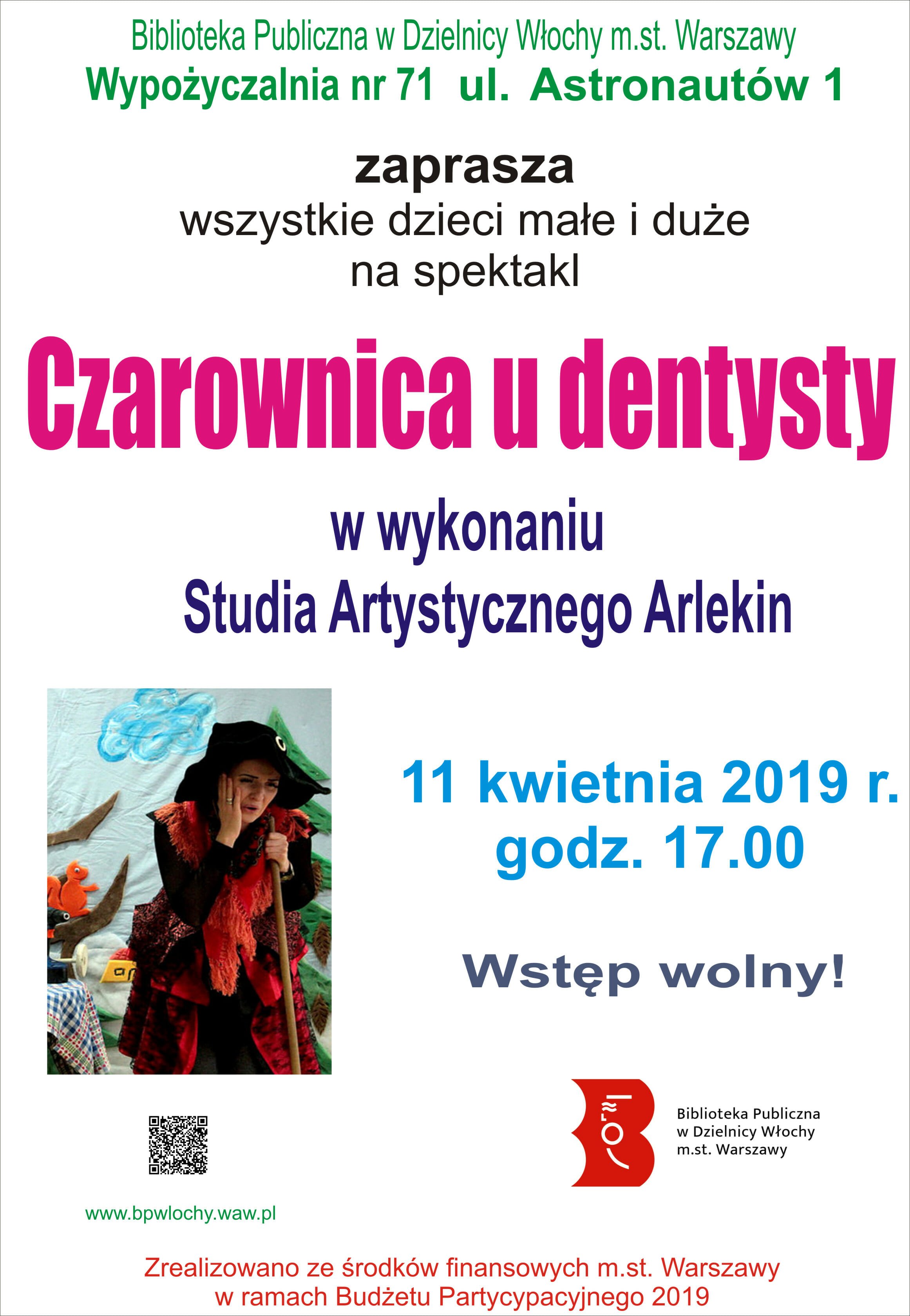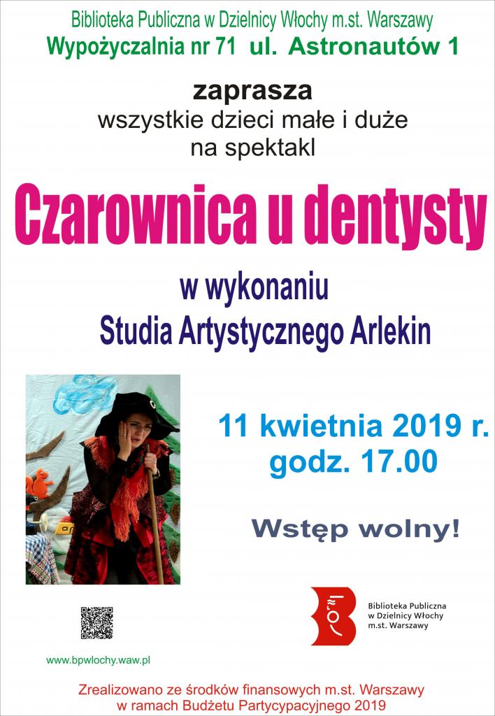 Wypożyczalnia nr 71 gorąco zaprasza na występ Studia Artystycznego Arlekin, podczas którego wspólnie obejrzymy historię zatytułowaną „Czarownica u dentysty”.