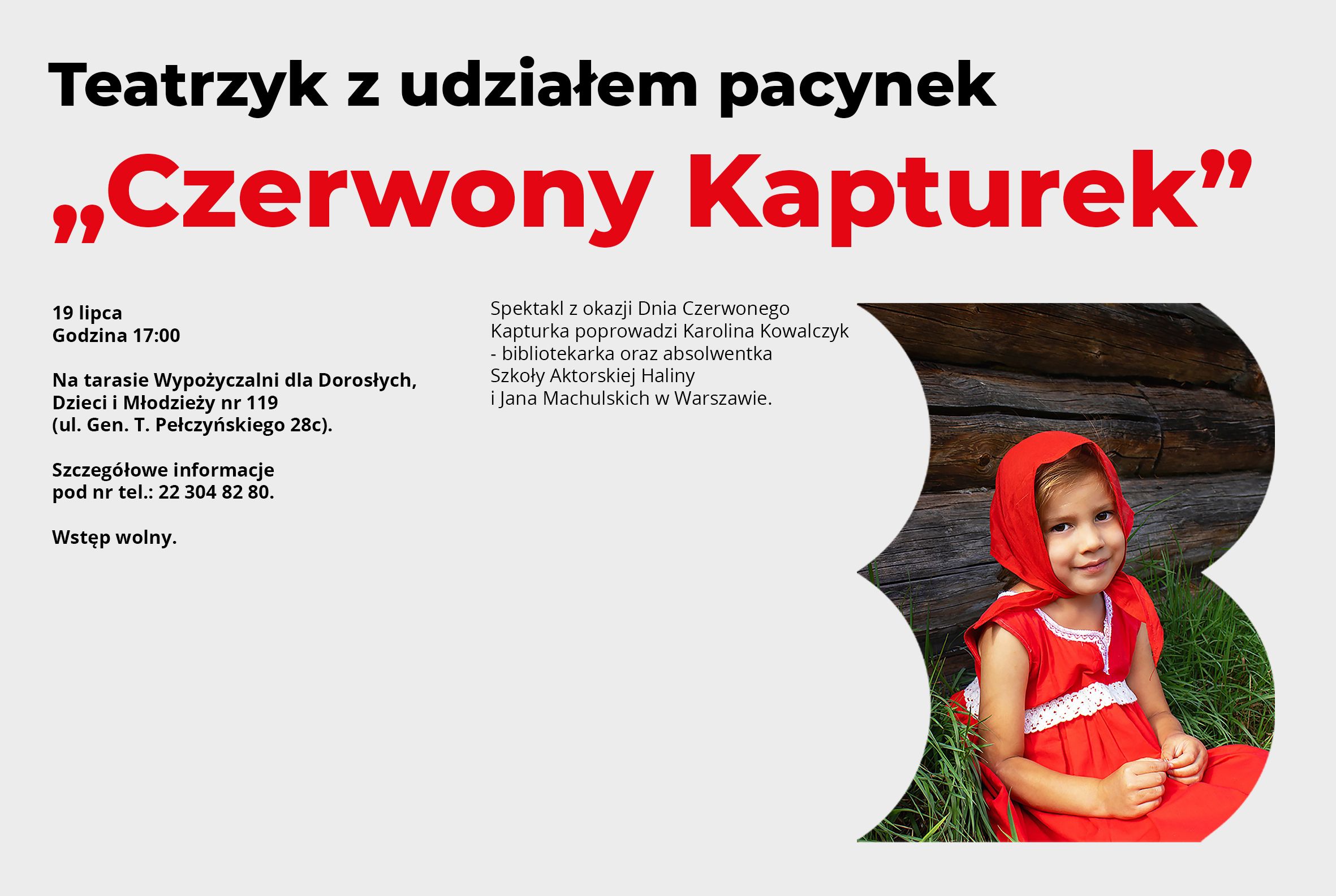 Z okazji Dnia Czerwonego Kapturka Biblioteka na Bemowie zaprasza dzieci na przedstawienie z udziałem pacynek pt. „Czerwony Kapturek”. Spektakl odbędzie się Wypożyczalni dla Dorosłych, Dzieci i Młodzieży nr 119 (ul. Gen. T. Pełczyńskiego 28c). Poprowadzi go nasza bibliotekarka Karolina Kowalczyk – absolwentka Szkoły aktorskiej Haliny i Jana Machulskich w Warszawie.
