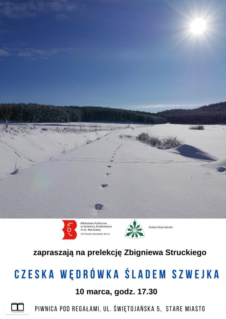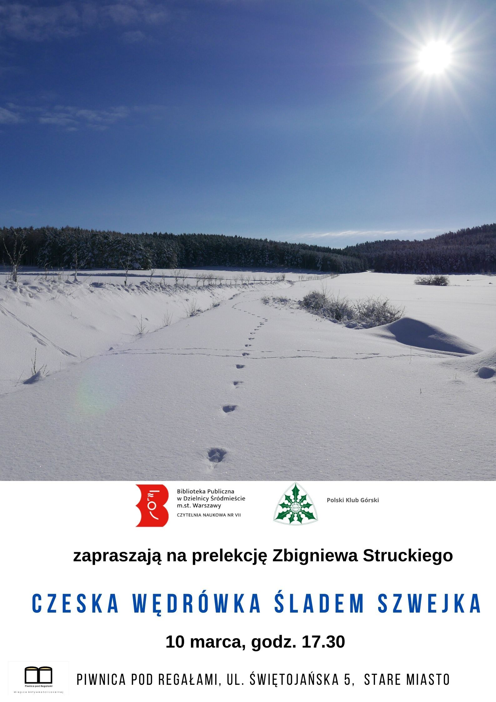 We wtorek 10 marca o godzinie 17:30 Biblioteka Publiczna w Dzielnicy Śródmieście m.st. Warszawy oraz Polski Klub Górski zapraszają na prelekcję Zbigniewa Struckiego pt. „Czeska wędrówka śladem Szwejka”.