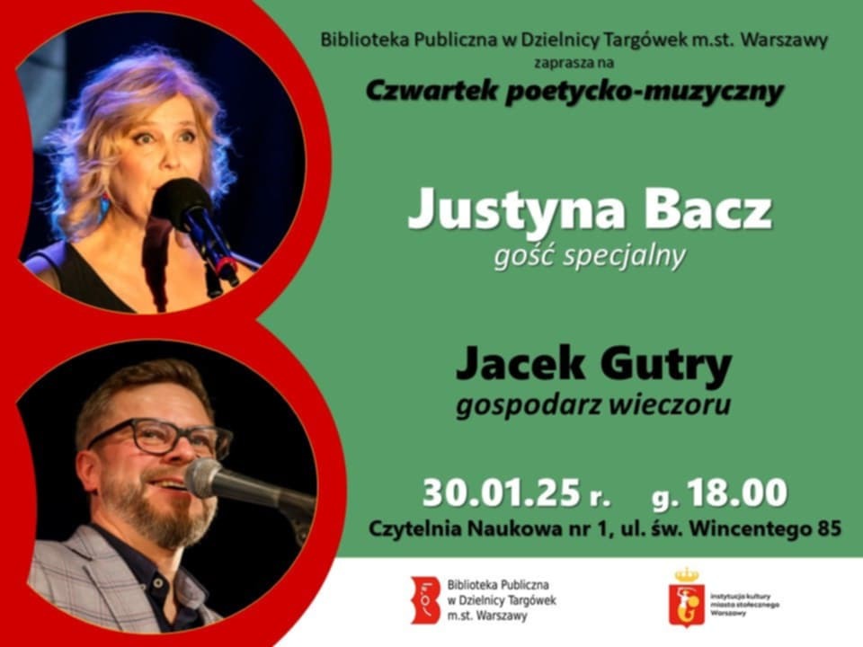 Gościem specjalnym styczniowego spotkania będzie JUSTYNA BACZ – piosenkarka, tłumaczka, autorka piosenek, lingwistka, pedagog. Za promowanie kultury francuskiej w Polsce została odznaczona Kawalerskim Orderem Sztuki i Literatury nadawanym przez Ministerstwo Kultury Republiki Francuskiej.