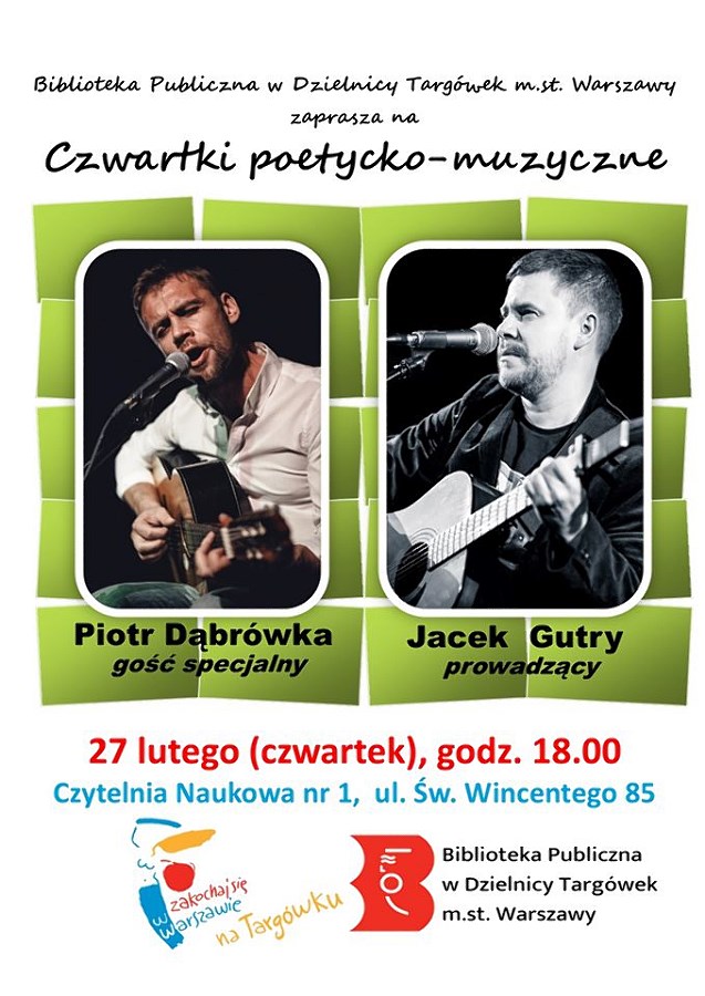 Podczas czwartkowego spotkania Piotr Dąbrówka zaprezentuje utwory autorskie oraz kompozycje do poezji Jonasza Kofty, Stanisława Grochowiaka, Marka Tercza, Tadeusza Nowaka, Mariana Piechala, Jacka Kaczmarskiego i Bolesława Leśmiana.