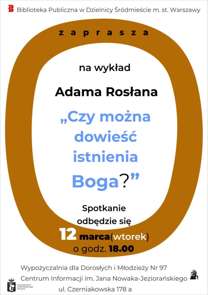 Biblioteka Publiczna w Dzielnicy Śródmieście m.st. Warszawy zaprasza na wykład Adama Rosłana pt. „Czy można dowieść istnienia Boga?”.