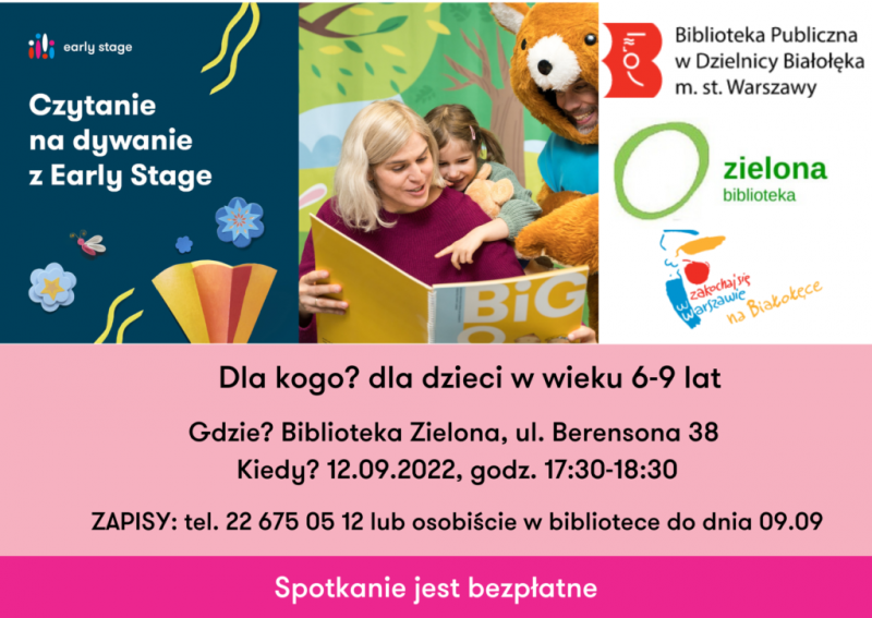 Po wakacjach wracamy do spotkań z językiem angielskim. Zapraszamy dzieci na czytanie na dywanie z Early Stage. Będziemy dużo mówić po angielsku, poznamy nowe słówka, ale też, jak zawsze na tych spotkaniach, będzie mnóstwo zabawy i śmiechu. Czekamy na Was razem z Early Stage 12 września o 17.30 w Bibliotece Zielonej.