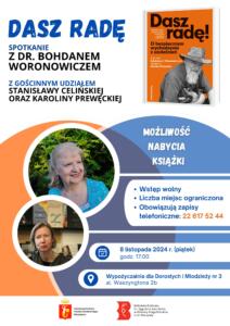 Wypożyczalnia dla Dorosłych i Młodzieży nr 3, mieszcząca się przy al. Waszyngtona 2b, zaprasza 8 listopada 2024 r. o godz. 17:00 na spotkanie „Dasz radę” z dr. Bohdanem Woronowiczem, Karoliną Prewęcką oraz Stanisławą Celińską. Uwaga, obowiązują zapisy. Szczegóły informacji dostępne są na plakacie.