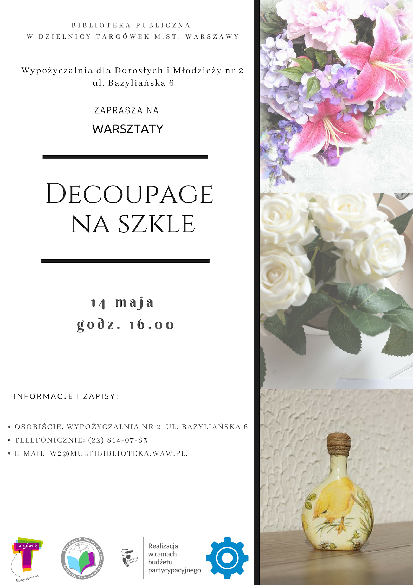 Biblioteka Publiczna w Dzielnicy Targówek m.st. Warszawy zaprasza na warsztaty „Decoupage na szkle”.