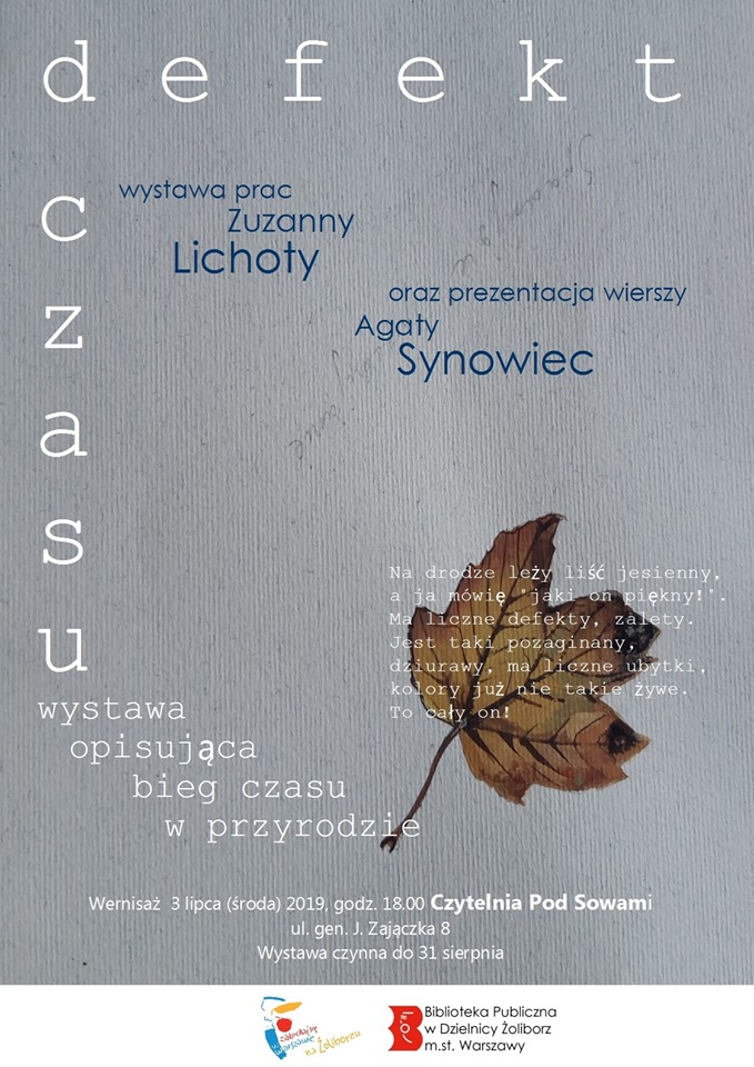 Biblioteka Publiczna w Dzielnicy Żoliborz m.st. Warszawy zaprasza na wernisaż i inaugurację trwającej całe wakacje wystawy akwareli, szkiców i haftów autorstwa Zuzanny Lichoty “Defekt Czasu”. Podczas spotkania zaprezentowana zostanie także poezja Agaty Synowiec. Uczestnicy będą mieli okazję przy poczęstunku porozmawiać z autorkami na temat koncepcji ich prac.