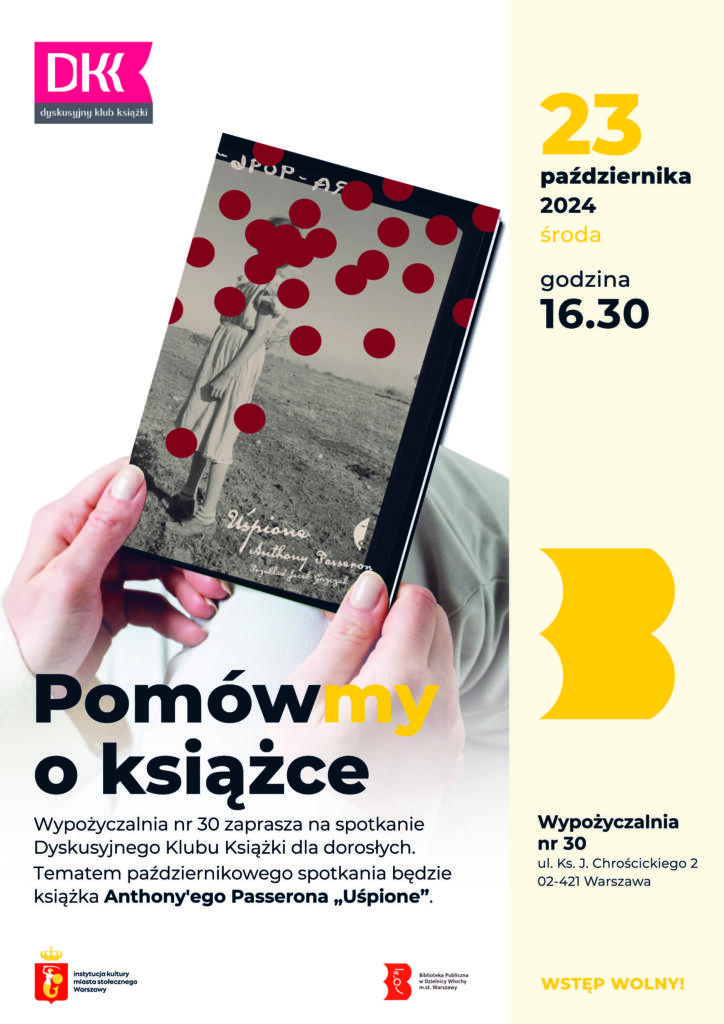 W środę 23 października 2024 o godz. 16.30 Wypożyczalnia nr 30 zaprasza na spotkanie Dyskusyjnego Klubu Książki dla dorosłych. Tematem październikowego spotkania będzie powieść Anthony’ego Passerona „Uśpione”.