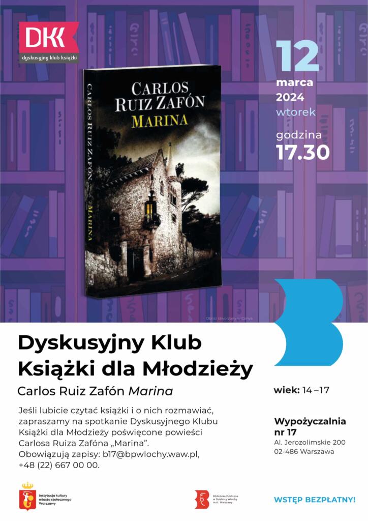 We wtorek 12 marca 2024 o godz. 17.30 zapraszamy młodzież lubiącą czytać do Wypożyczalni nr 17 na spotkanie Dyskusyjnego Klubu Książki dla Młodzieży (14-17 lat).