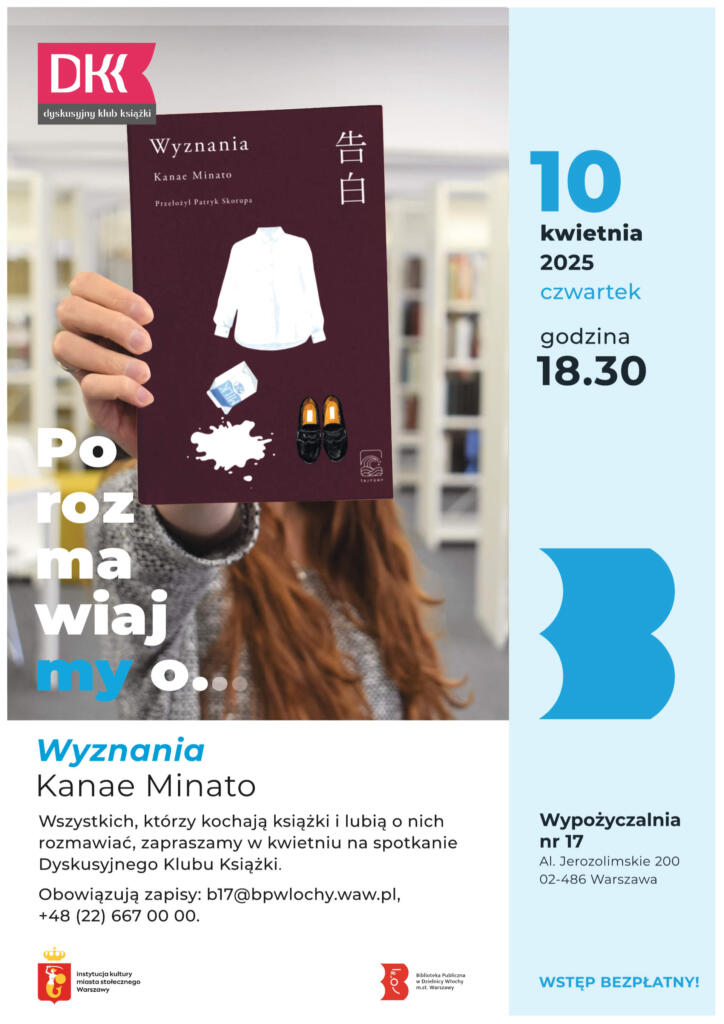 W czwartek 10 kwietnia 2025 o godz. 18.30 Wypożyczalnia nr 17 zaprasza wszystkich, którzy kochają książki i lubią o nich rozmawiać, na spotkanie Dyskusyjnego Klubu Książki dotyczące książki „Wyznania” Kanae Minato w przekładzie Patryka Skorupy, wydanej przez Wydawnictwo Tajfuny w 2024.